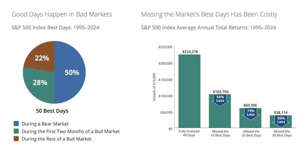 Getting out before the biggest drops, and back in before the recovery, requires great timing. Not just once, but twice. Most investors miss the upswing, which can significantly impact the long-term performance of a portfolio.