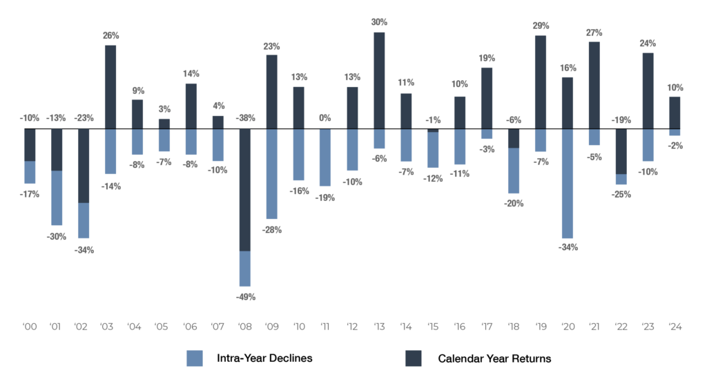 The image above depicts two figures: (1) the biggest market drop within the calendar year, and (2) where the market ended up overall on December 31.